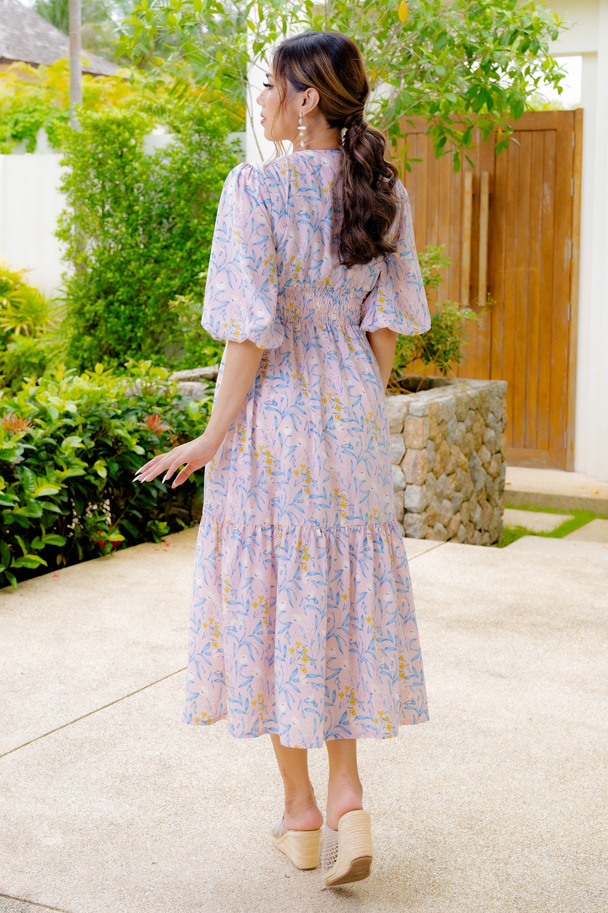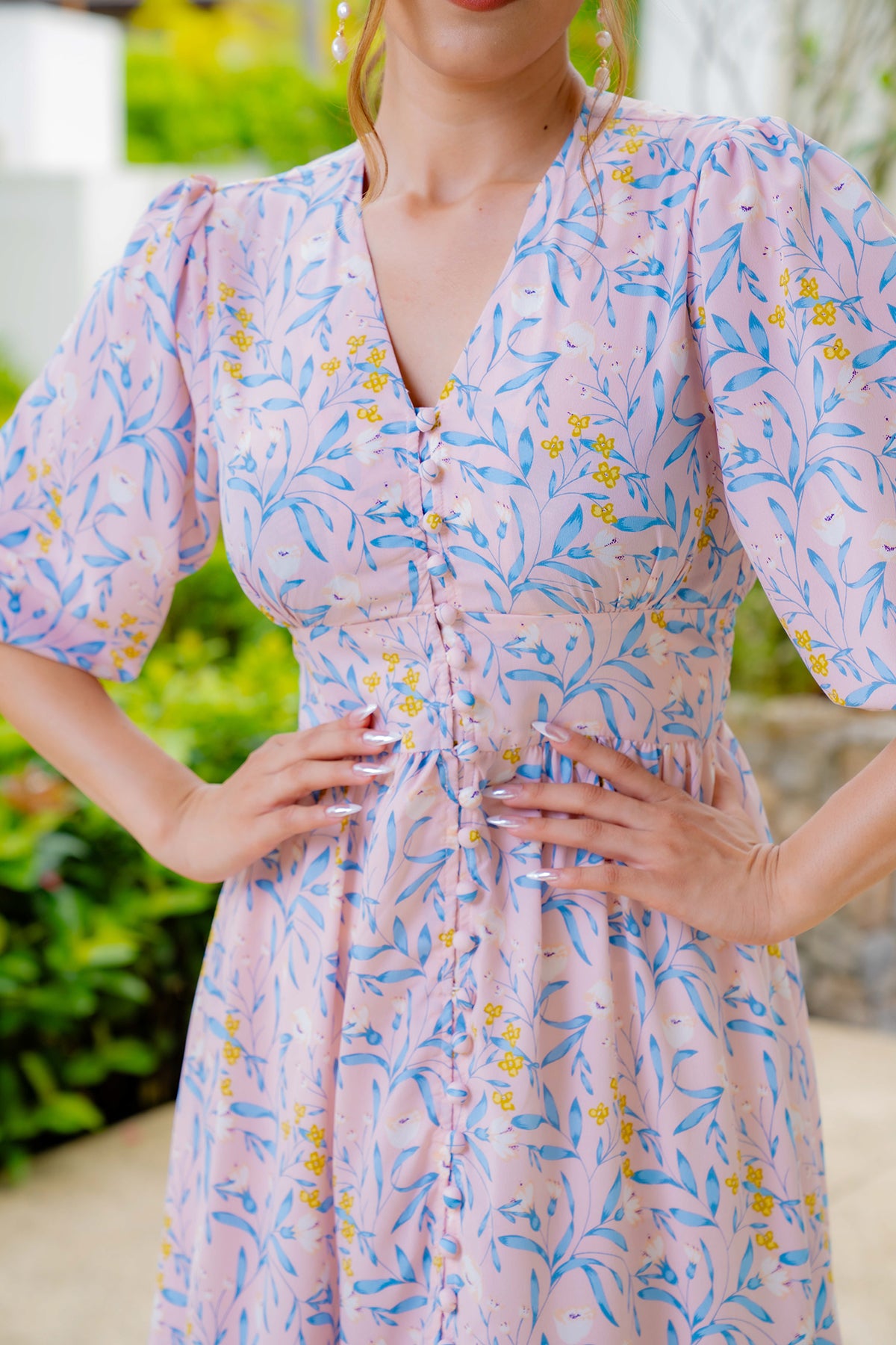 DEBORAH V Neck Floral Printed Pouf Ruffle Dress